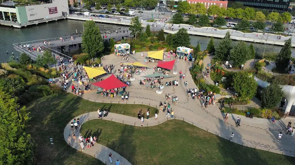 In 2021, Blindtek Designer Systems installed seven motorized "Fold and Roll" sail shades from SunSquare® International at Little Island Park in NYC.